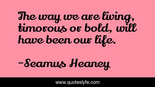 This page presents the quote "The way we are living, timorous or bold, will have been our life.". Author of this quote is Seamus Heaney. This quote is about living, life, poetry, bravery, choices,.