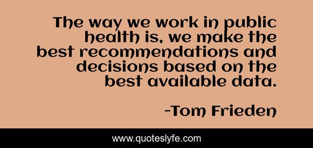 This page presents the quote "The way we work in public health is, we make the best recommendations and decisions based on the best available data.". Author of this quote is Tom Frieden. This quote is about work, decisions, best,.