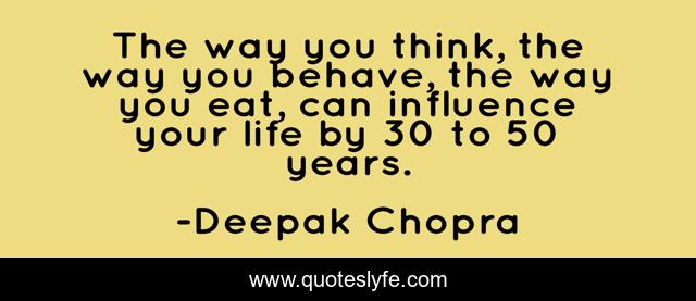 This page presents the quote "The way you think, the way you behave, the way you eat, can influence your life by 30 to 50 years.". Author of this quote is Deepak Chopra. This quote is about life, influence, think,.
