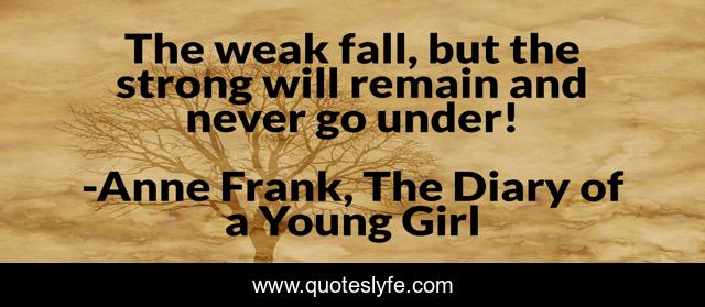 This page presents the quote "The weak fall, but the strong will remain and never go under!". Author of this quote is Anne Frank, The Diary of a Young Girl. This quote is about survival, anne-frank, weak, strong,.