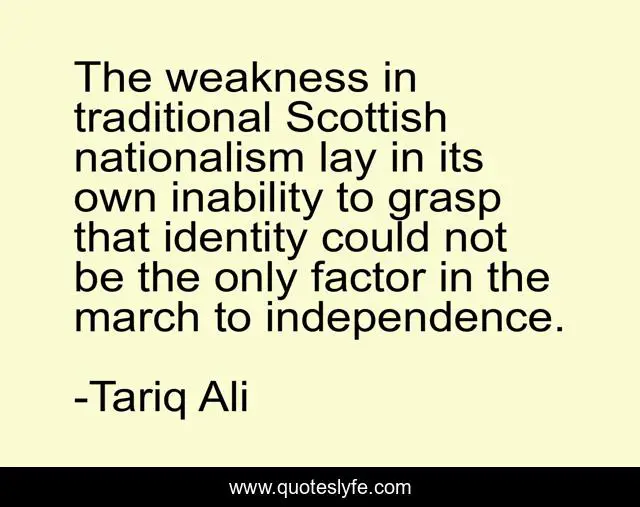 This page presents the quote "The weakness in traditional Scottish nationalism lay in its own inability to grasp that identity could not be the only factor in the march to independence.". Author of this quote is Tariq Ali. This quote is about weakness, identity,.