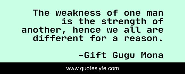 This page presents the quote "The weakness of one man is the strength of another, hence we all are different for a reason.". Author of this quote is Gift Gugu Mona. This quote is about weakness, reason, strength, appreciating-people, different,.