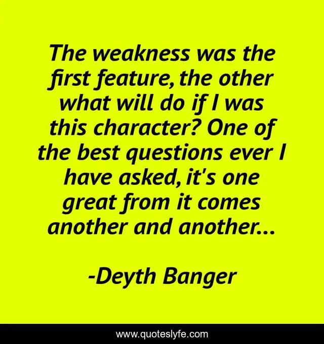 This page presents the quote "The weakness was the first feature, the other what will do if I was this character? One of the best questions ever I have asked, it's one great from it comes another and another...". Author of this quote is Deyth Banger. This quote is about weakness, character, feature, the, was, first,.