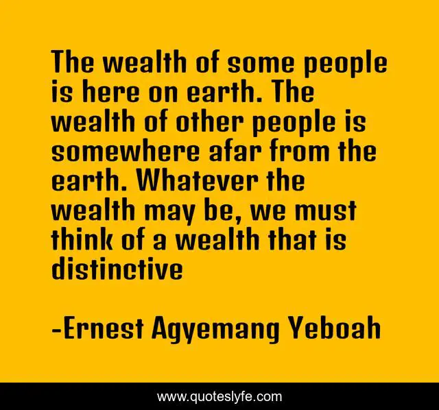 This page presents the quote "The wealth of some people is here on earth. The wealth of other people is somewhere afar from the earth. Whatever the wealth may be, we must think of a wealth that is distinctive". Author of this quote is Ernest Agyemang Yeboah. This quote is about joy-of-life, material-gains, wealth, wealth-creation, joy, living-well, riches, distinctive-footprints, thought,.