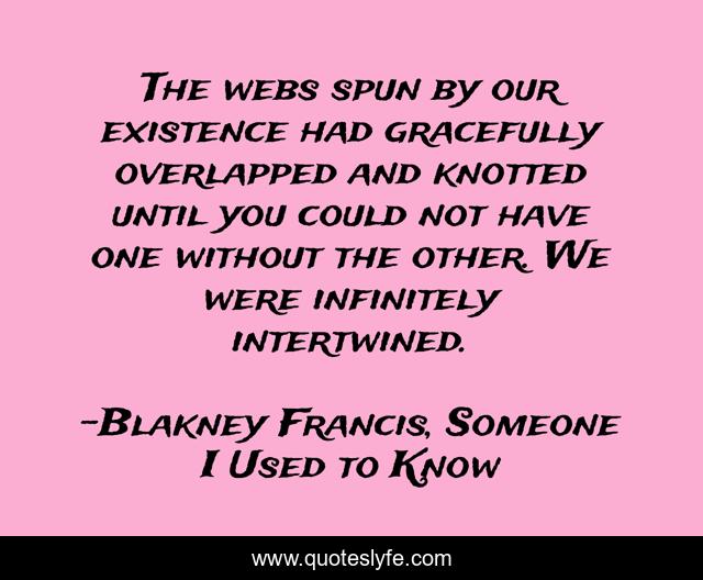 This page presents the quote "The webs spun by our existence had gracefully overlapped and knotted until you could not have one without the other. We were infinitely intertwined.". Author of this quote is Blakney Francis, Someone I Used to Know. This quote is about romance, friends, love, soul-mates, affection,.