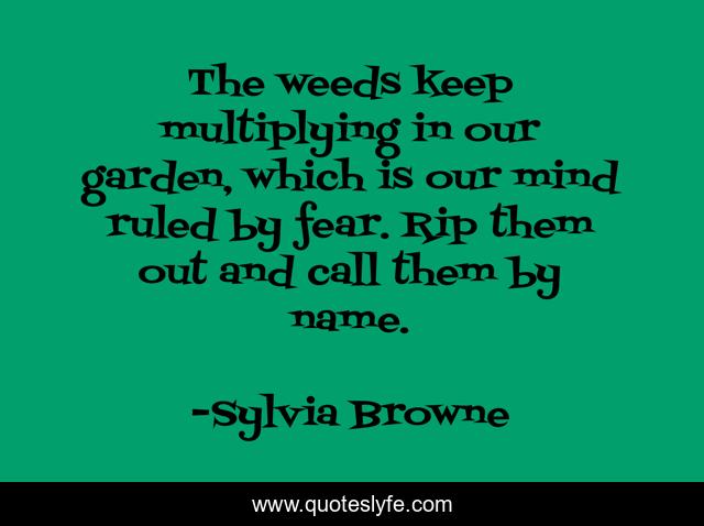 This page presents the quote "The weeds keep multiplying in our garden, which is our mind ruled by fear. Rip them out and call them by name.". Author of this quote is Sylvia Browne. This quote is about confidence, garden, positive, motivational, mind, optimistic,.