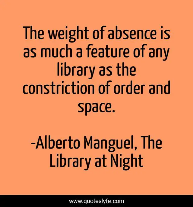 This page presents the quote "The weight of absence is as much a feature of any library as the constriction of order and space.". Author of this quote is Alberto Manguel, The Library at Night. This quote is about libraries, library,.