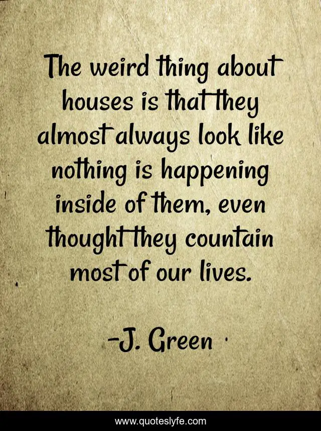 This page presents the quote "The weird thing about houses is that they almost always look like nothing is happening inside of them, even thought they countain most of our lives.". Author of this quote is J. Green. This quote is about enthusiasm, life-and-living, inspirational,.