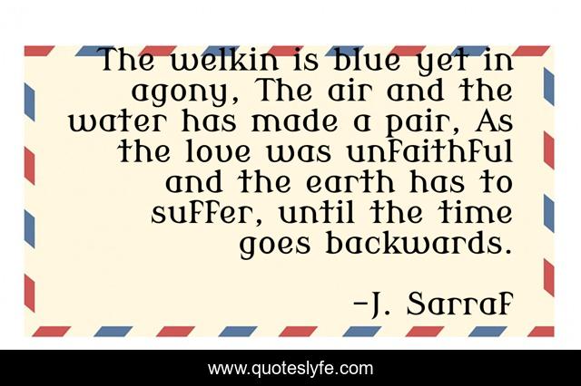 This page presents the quote "The welkin is blue yet in agony, The air and the water has made a pair, As the love was unfaithful and the earth has to suffer, until the time goes backwards.". Author of this quote is J. Sarraf. This quote is about deep-thoughts, love, thoughts, affection, thoughts-of-the-mind,.