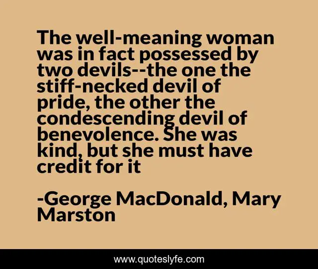 This page presents the quote "The well-meaning woman was in fact possessed by two devils--the one the stiff-necked devil of pride, the other the condescending devil of benevolence. She was kind, but she must have credit for it". Author of this quote is George MacDonald, Mary Marston. .