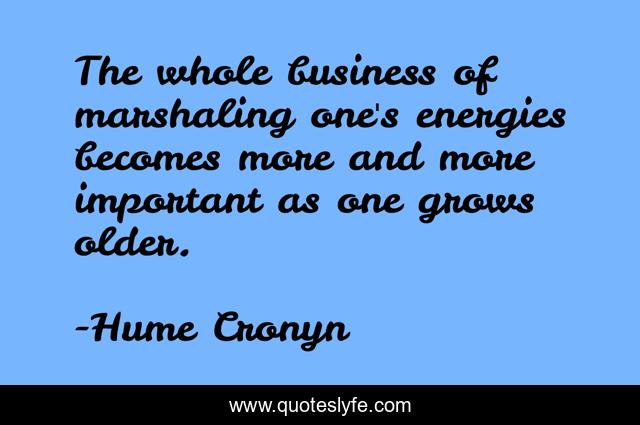 This page presents the quote "The whole business of marshaling one's energies becomes more and more important as one grows older.". Author of this quote is Hume Cronyn. This quote is about important, business, older,.