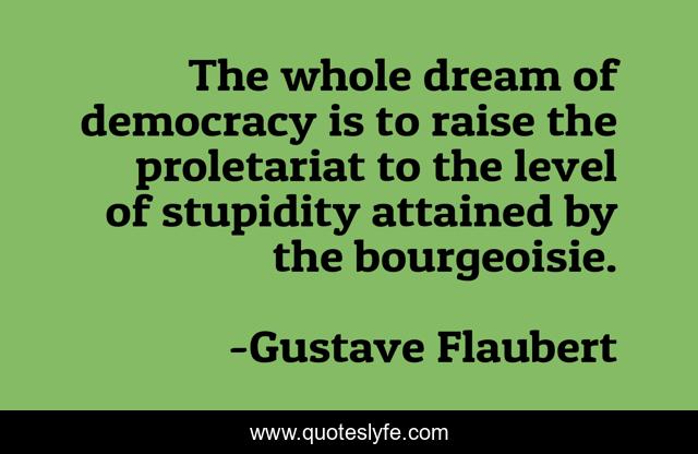 This page presents the quote "The whole dream of democracy is to raise the proletariat to the level of stupidity attained by the bourgeoisie.". Author of this quote is Gustave Flaubert. This quote is about politics, democracy,.