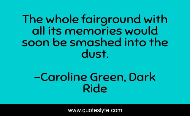 This page presents the quote "The whole fairground with all its memories would soon be smashed into the dust.". Author of this quote is Caroline Green, Dark Ride. This quote is about dust, fairground, memories, smashed,.