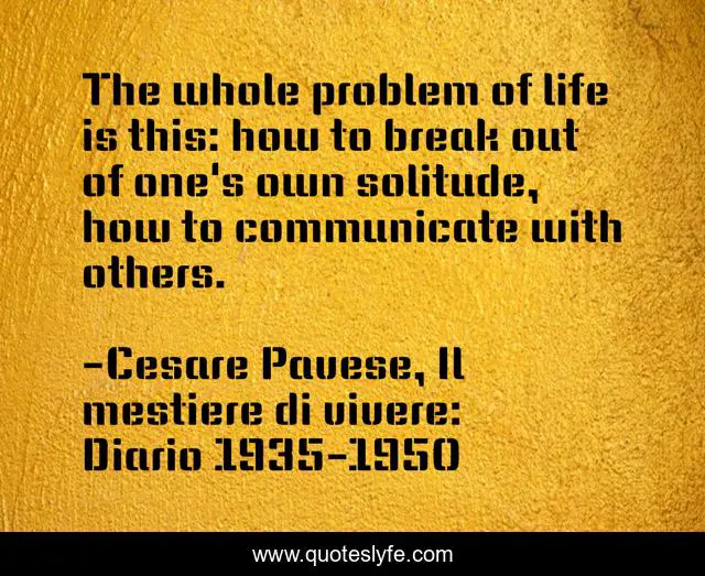 This page presents the quote "The whole problem of life is this: how to break out of one's own solitude, how to communicate with others.". Author of this quote is Cesare Pavese, Il mestiere di vivere: Diario 1935-1950. This quote is about communication, loneliness, solitude,.