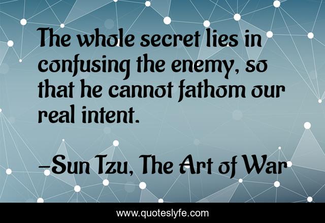 This page presents the quote "The whole secret lies in confusing the enemy, so that he cannot fathom our real intent.". Author of this quote is Sun Tzu, The Art of War. This quote is about war, business, strategy,.