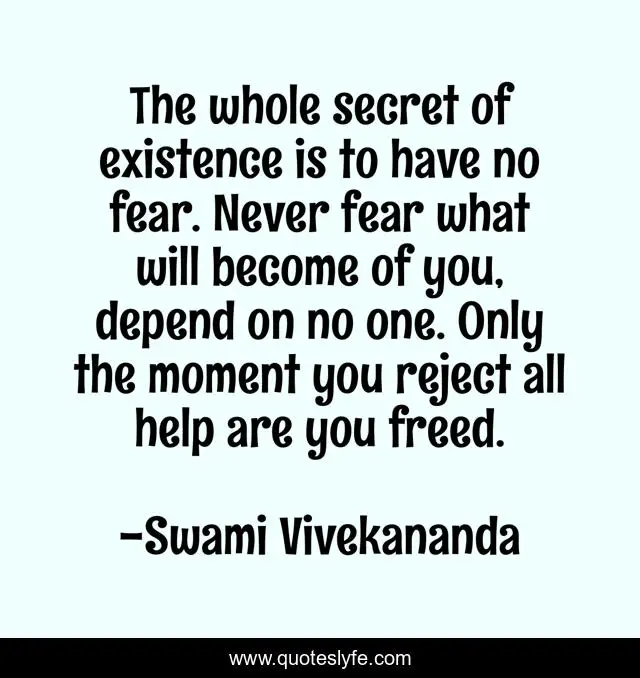 This page presents the quote "The whole secret of existence is to have no fear. Never fear what will become of you, depend on no one. Only the moment you reject all help are you freed.". Author of this quote is Swami Vivekananda. This quote is about moment, help,.
