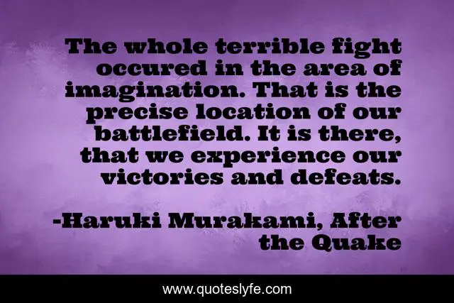This page presents the quote "The whole terrible fight occured in the area of imagination. That is the precise location of our battlefield. It is there, that we experience our victories and defeats.". Author of this quote is Haruki Murakami, After the Quake. .