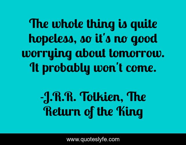 This page presents the quote "The whole thing is quite hopeless, so it's no good worrying about tomorrow. It probably won't come.". Author of this quote is J.R.R. Tolkien, The Return of the King. This quote is about despair, hopelessness, worry,.
