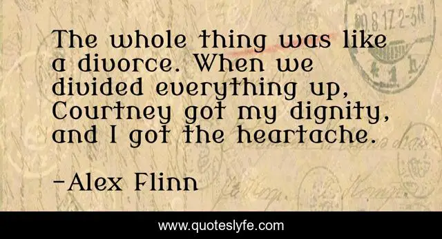 This page presents the quote "The whole thing was like a divorce. When we divided everything up, Courtney got my dignity, and I got the heartache.". Author of this quote is Alex Flinn. This quote is about heartbreak, friendship-lost,.