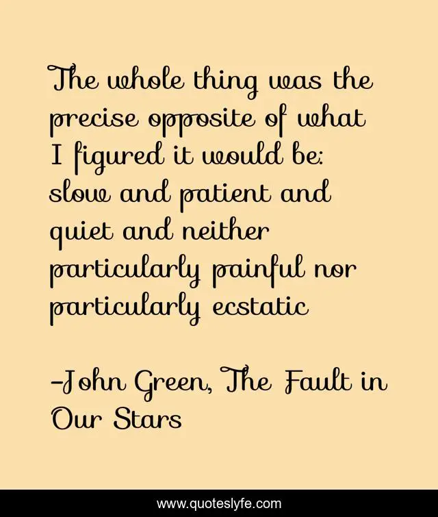 This page presents the quote "The whole thing was the precise opposite of what I figured it would be: slow and patient and quiet and neither particularly painful nor particularly ecstatic". Author of this quote is John Green, The Fault in Our Stars. This quote is about the-fault-in-our-stars, john-green, journey,.