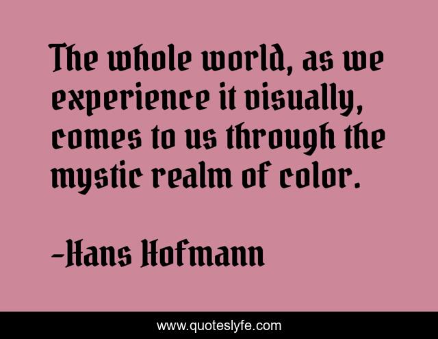 This page presents the quote "The whole world, as we experience it visually, comes to us through the mystic realm of color.". Author of this quote is Hans Hofmann. This quote is about color, world, through,.