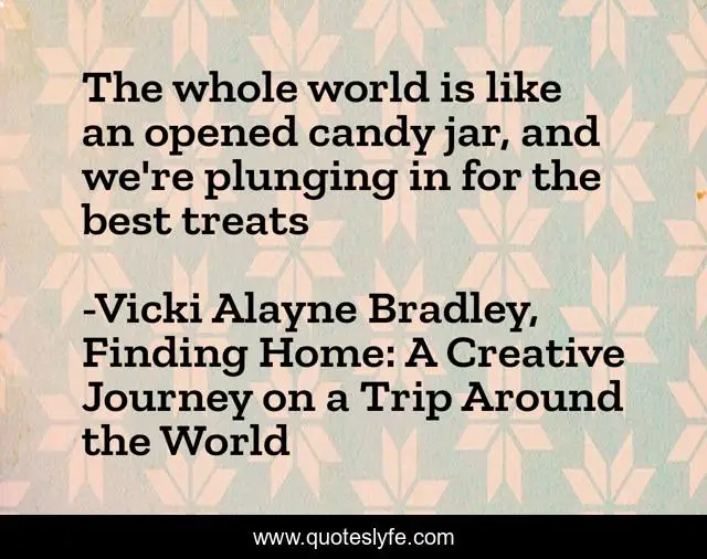 This page presents the quote "The whole world is like an opened candy jar, and we're plunging in for the best treats". Author of this quote is Vicki Alayne Bradley, Finding Home: A Creative Journey on a Trip Around the World. This quote is about art, artist, couple, creativity, writing, journey, inspirational, world-travel, enthusiasm,.