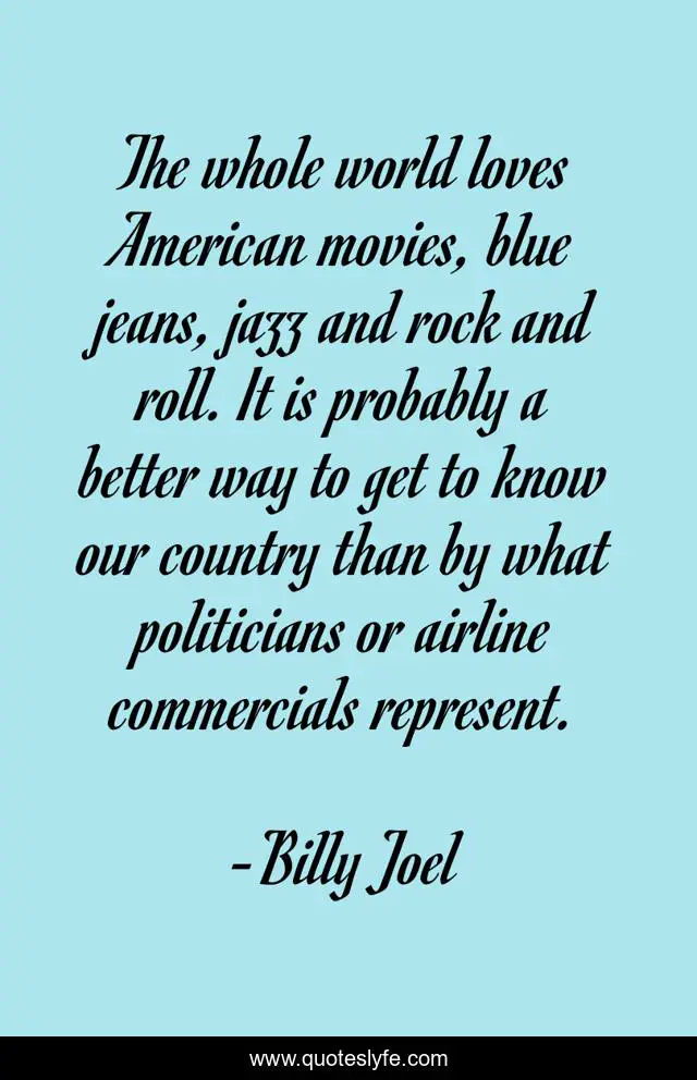 This page presents the quote "The whole world loves American movies, blue jeans, jazz and rock and roll. It is probably a better way to get to know our country than by what politicians or airline commercials represent.". Author of this quote is Billy Joel. This quote is about blue, world, american,.