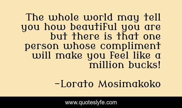 This page presents the quote "The whole world may tell you how beautiful you are but there is that one person whose compliment will make you feel like a million bucks!". Author of this quote is Lorato Mosimakoko. This quote is about happy-life, love, affection,.