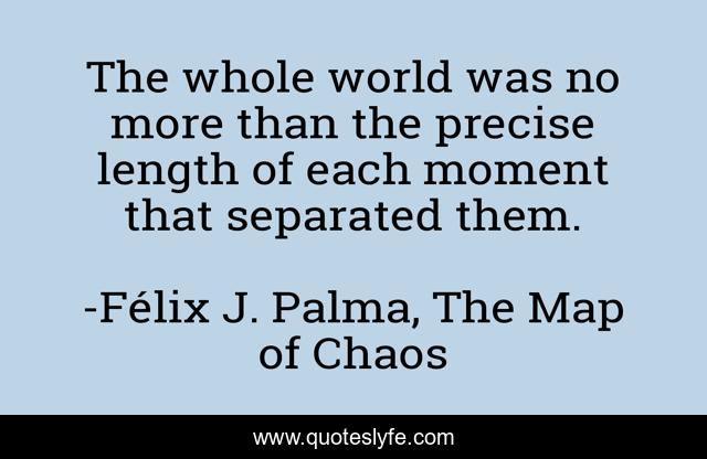This page presents the quote "The whole world was no more than the precise length of each moment that separated them.". Author of this quote is Félix J. Palma, The Map of Chaos. This quote is about love, affection, time,.