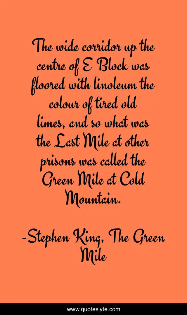 This page presents the quote "The wide corridor up the centre of E Block was floored with linoleum the colour of tired old limes, and so what was the Last Mile at other prisons was called the Green Mile at Cold Mountain.". Author of this quote is Stephen King, The Green Mile. This quote is about green, death-sentence, mile, last, prison,.