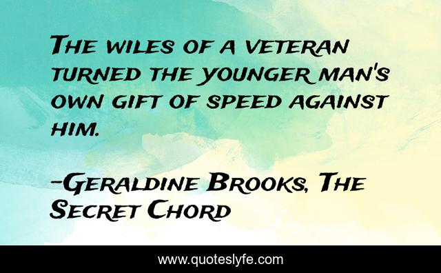 This page presents the quote "The wiles of a veteran turned the younger man's own gift of speed against him.". Author of this quote is Geraldine Brooks, The Secret Chord. This quote is about haste, experience, strategy,.