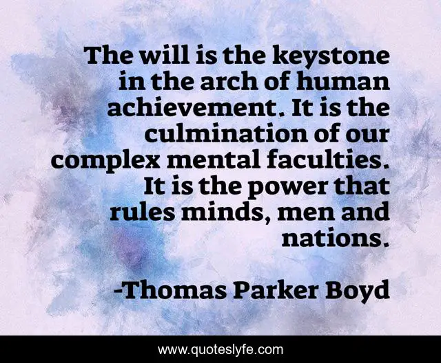 This page presents the quote "The will is the keystone in the arch of human achievement. It is the culmination of our complex mental faculties. It is the power that rules minds, men and nations.". Author of this quote is Thomas Parker Boyd. .