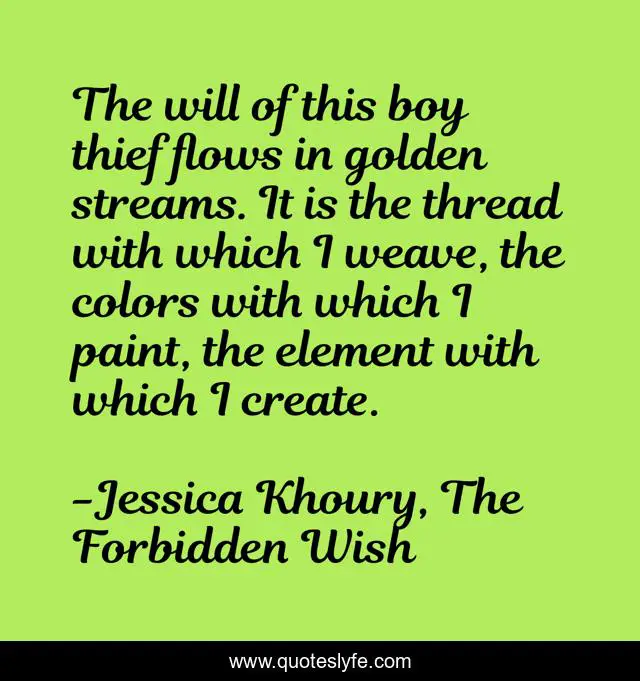 This page presents the quote "The will of this boy thief flows in golden streams. It is the thread with which I weave, the colors with which I paint, the element with which I create.". Author of this quote is Jessica Khoury, The Forbidden Wish. This quote is about color, magic, weaving, thread, wish,.