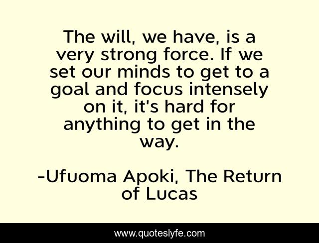 This page presents the quote "The will, we have, is a very strong force. If we set our minds to get to a goal and focus intensely on it, it’s hard for anything to get in the way.". Author of this quote is Ufuoma Apoki, The Return of Lucas. This quote is about strong, focus, minds, achieving-goals, intensity, strong-force,.