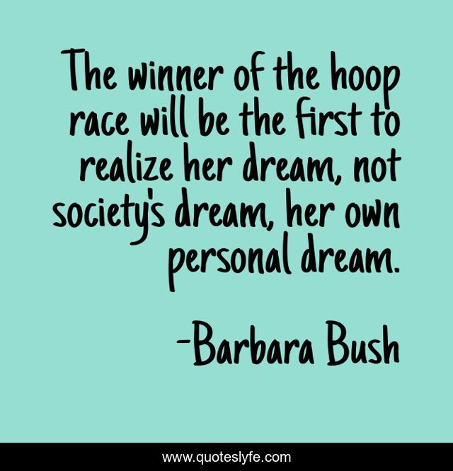 This page presents the quote "The winner of the hoop race will be the first to realize her dream, not society's dream, her own personal dream.". Author of this quote is Barbara Bush. This quote is about winner, dream, realize,.
