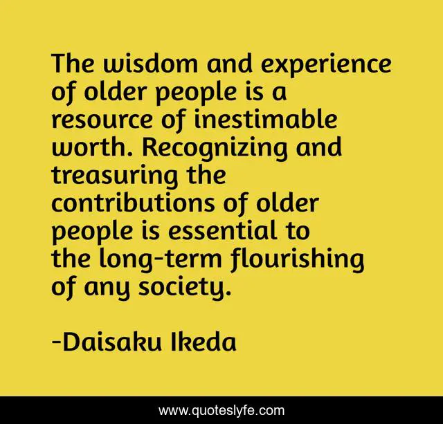 This page presents the quote "The wisdom and experience of older people is a resource of inestimable worth. Recognizing and treasuring the contributions of older people is essential to the long-term flourishing of any society.". Author of this quote is Daisaku Ikeda. This quote is about society, experience, people,.