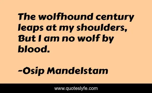 This page presents the quote "The wolfhound century leaps at my shoulders, But I am no wolf by blood.". Author of this quote is Osip Mandelstam. This quote is about totalitarianism, danger,.