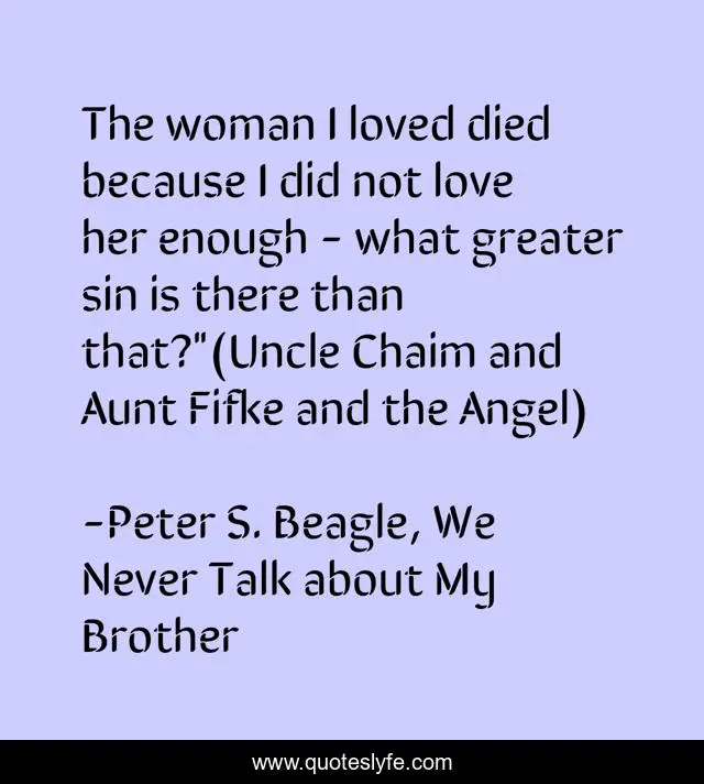 This page presents the quote "The woman I loved died because I did not love her enough - what greater sin is there than that?"(Uncle Chaim and Aunt Fifke and the Angel)". Author of this quote is Peter S. Beagle, We Never Talk about My Brother. This quote is about shame, love, sin, affection,.