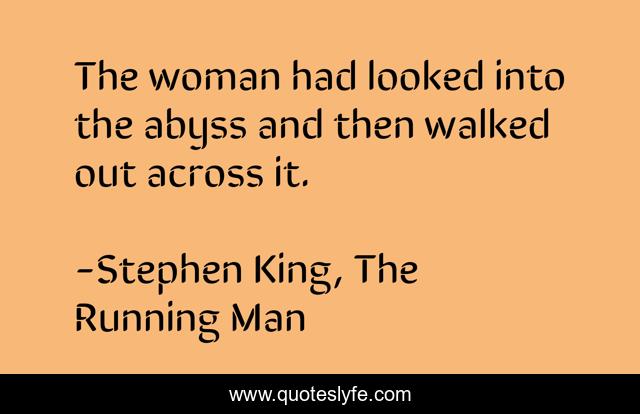 This page presents the quote "The woman had looked into the abyss and then walked out across it.". Author of this quote is Stephen King, The Running Man. This quote is about stephen, king, running, man,.