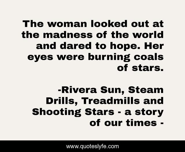 This page presents the quote "The woman looked out at the madness of the world and dared to hope. Her eyes were burning coals of stars.". Author of this quote is Rivera Sun, Steam Drills, Treadmills and Shooting Stars - a story of our times -. This quote is about strength, inspirational, mothers, courage, stars, world, enthusiasm, women-s-fiction, hope,.