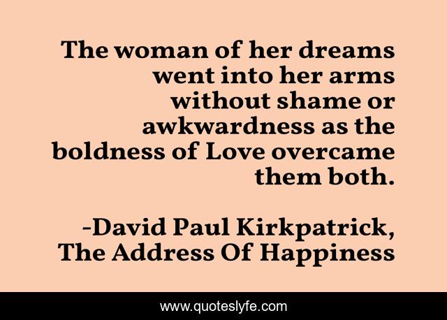 This page presents the quote "The woman of her dreams went into her arms without shame or awkwardness as the boldness of Love overcame them both.". Author of this quote is David Paul Kirkpatrick, The Address Of Happiness. This quote is about love, soulmates, affection,.