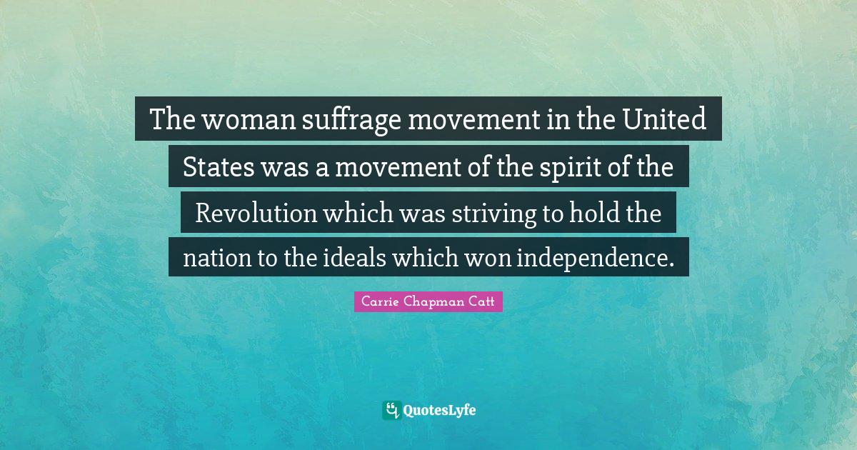 This page presents the quote "The woman suffrage movement in the United States was a movement of the spirit of the Revolution which was striving to hold the nation to the ideals which won independence.". Author of this quote is Carrie Chapman Catt. This quote is about revolution, united states, woman suffrage, movement, independence, spirit, ideals,.