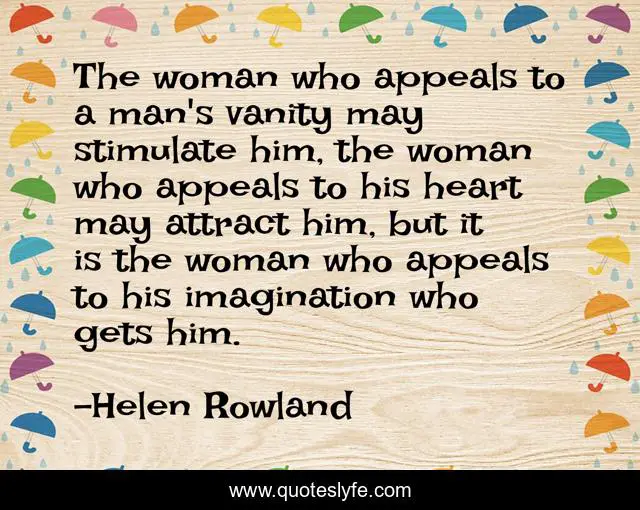 This page presents the quote "The woman who appeals to a man's vanity may stimulate him, the woman who appeals to his heart may attract him, but it is the woman who appeals to his imagination who gets him.". Author of this quote is Helen Rowland. This quote is about heart, woman, man,.