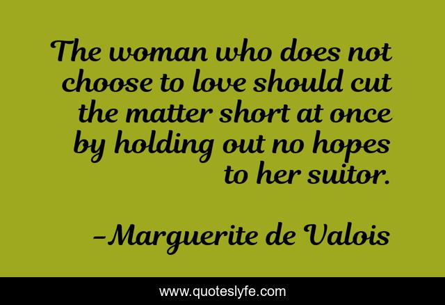 This page presents the quote "The woman who does not choose to love should cut the matter short at once by holding out no hopes to her suitor.". Author of this quote is Marguerite de Valois. This quote is about helping, people,.