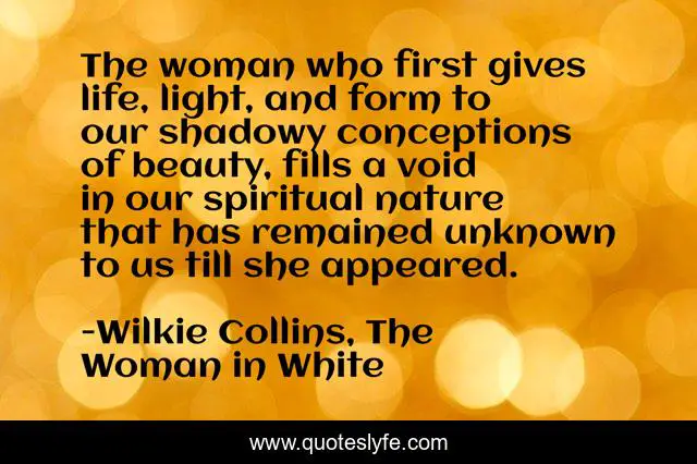 This page presents the quote "The woman who first gives life, light, and form to our shadowy conceptions of beauty, fills a void in our spiritual nature that has remained unknown to us till she appeared.". Author of this quote is Wilkie Collins, The Woman in White. This quote is about life, concept, beauty, concepts-of-beauty, nature, unknown, void, concepts, spiritual,.