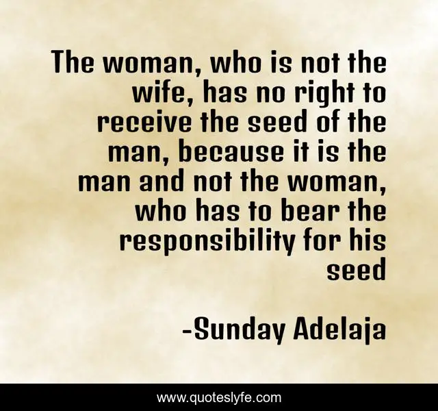 This page presents the quote "The woman, who is not the wife, has no right to receive the seed of the man, because it is the man and not the woman, who has to bear the responsibility for his seed". Author of this quote is Sunday Adelaja. This quote is about woman, man, wife,.