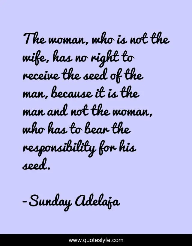 This page presents the quote "The woman, who is not the wife, has no right to receive the seed of the man, because it is the man and not the woman, who has to bear the responsibility for his seed.". Author of this quote is Sunday Adelaja. This quote is about receive, woman, right, seed, wife,.