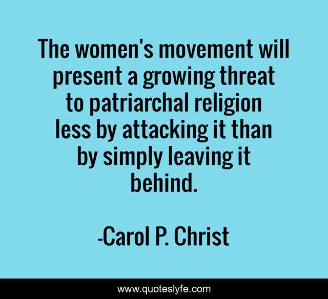This page presents the quote "The women's movement will present a growing threat to patriarchal religion less by attacking it than by simply leaving it behind.". Author of this quote is Carol P. Christ. This quote is about women, present, leaving,.