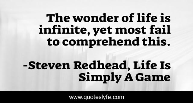 This page presents the quote "The wonder of life is infinite, yet most fail to comprehend this.". Author of this quote is Steven Redhead, Life Is Simply A Game. This quote is about infinite, life, comprehend, wonder,.