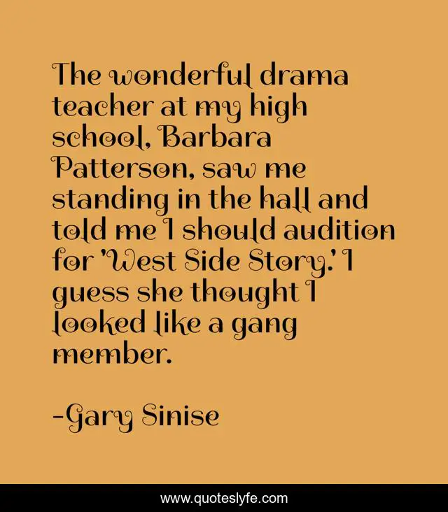This page presents the quote "The wonderful drama teacher at my high school, Barbara Patterson, saw me standing in the hall and told me I should audition for 'West Side Story.' I guess she thought I looked like a gang member.". Author of this quote is Gary Sinise. This quote is about thought, me, school,.